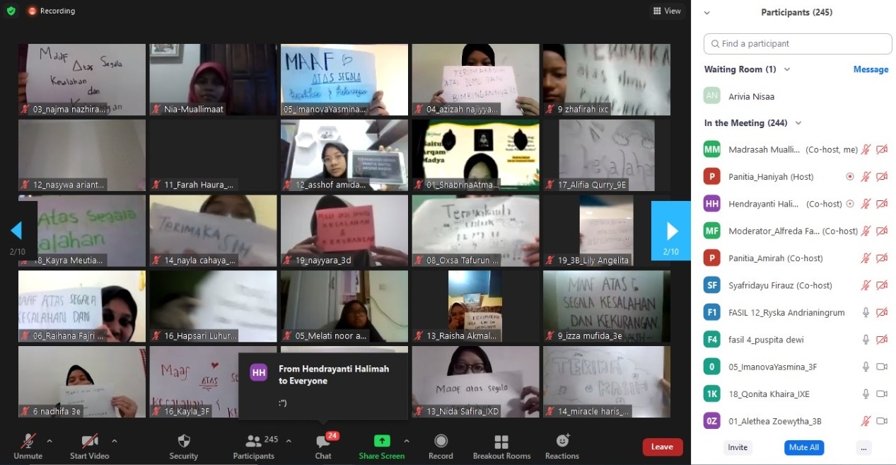 “BA Madya berjalan dengan baik melalui kolaborasi beberapa platform media digital, seperti Whatsappa group, Zoom Meeting, dan Google Meet. Jadwal tetap sama seperti perkaderan non-virtual, yakni pengaturan agenda kegiatan seperti penyampaian materi ataupun kegiatan khsusu mulai dari bagun tidur hingga tidur lagi dengan sistem pendampingan dari fasilitator. Fasilitator ini berasal dari berbagai alumni yang telah berkecimpung dan mempunya wawasan tentang perkaderan. Mereka merupakan alumni Mu’allimaat yang masih melaksanakan studi di perguruan tinggi di berbagai daerah di Indonesi, seperti ITB, UGM, bahkan ada yang berasal dari Mesir dan Turky. Dimana setiap kelompok bersama satu fasilitator terdiri dari 10-20 peserta”, jelas Ibu Unik Rasyidah, M.Pd. selaku Wakil Direktur III dan sebagai penanggung jawab perkaderan pasca kegiatan.